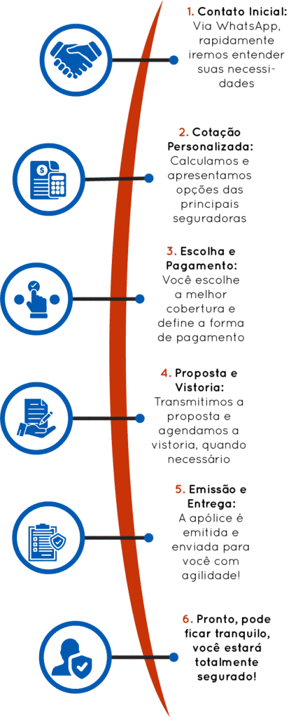 Após o contato inicial, solicitamos alguns dados essenciais, realizamos os cálculos e apresentamos as melhores opções de seguradoras para que você possa escolher a cobertura que melhor atende às suas necessidades.